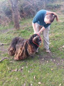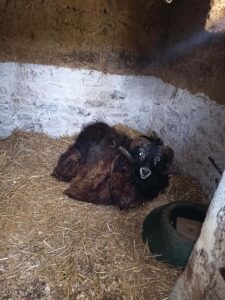 Suite à un signalement et grâce à une bénévole, ce bélier, Soot, a pu être pris en charge par l’association. Il était dans un état de maigreur extrême et fortement déshydraté. Sa laine formait un amas lourd, trempé et compact, au point qu’il n’avait quasiment plus rien pour le protéger sur le dos. L’association Le Vieux Zoo a pu le mettre à l’abri temporairement, afin d’assurer une prise en charge rapide, avant qu’il ne rejoigne sa famille d’accueil. Lors de la coupe, une masse a été découverte… Grâce à Calie, Soot revit : il se déplace sans peine et profite enfin de foin à volonté.